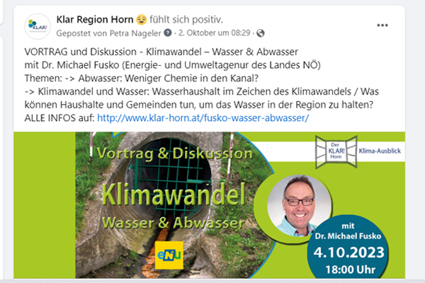 Dr. Michael Fusko von der Energie- und Umweltagentur des Landes NÖ veranschaulichte im Vortrag die aktuelle Situation im Umgang mit Wasser und Abwasser und zeigte auf, was auch die Haushalte und Gemeinden tun können, um das Wasser in der Region zu halten.