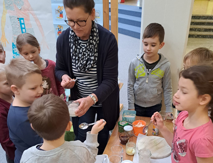 Die Seminarbäuerinnen besuchten die Schule, um die SchülerInnen der ersten Klassen im Umgang mit Lebensmitteln zu sensibilisieren. Dabei wurde den Kindern aufgezeigt, wie bestimmte regionale Produkte hergestellt und im Rahmen einer Mahlzeit sinnvoll verwendet werden können. Die Themen Umwelt, Natur und Lebensqualität spielten an diesem Vormittag in unserer Schule eine große Rolle.
