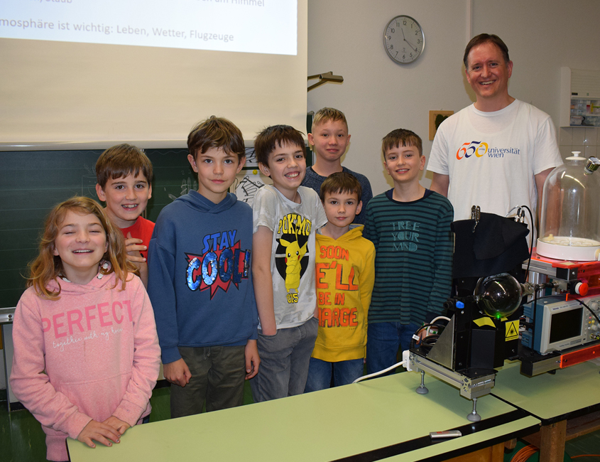 Wie entstehen Wolken und welchen Einfluss haben sie auf Wetter und Klima? Wie bildet sich ein Regenbogen und warum ist er rund? Wer ist stärker – Luft oder Wasser? Welche Farbe hat der Himmel? Diese und noch viele andere Fragen wurden den SchülerInnen der 2.-4. Schulstufen von Prof. Dr. Winkler von der Universität Wien, der an der Universität Wien im Bereich Aerosolphysik und Umweltphysik tätig ist, anschaulich erklärt. Mit Hilfe der mitgebrachten Wolkenkammer konnten die Kinder selbst Wolken erzeugen. Die SchülerInnen waren allesamt von den Experimenten begeistert.